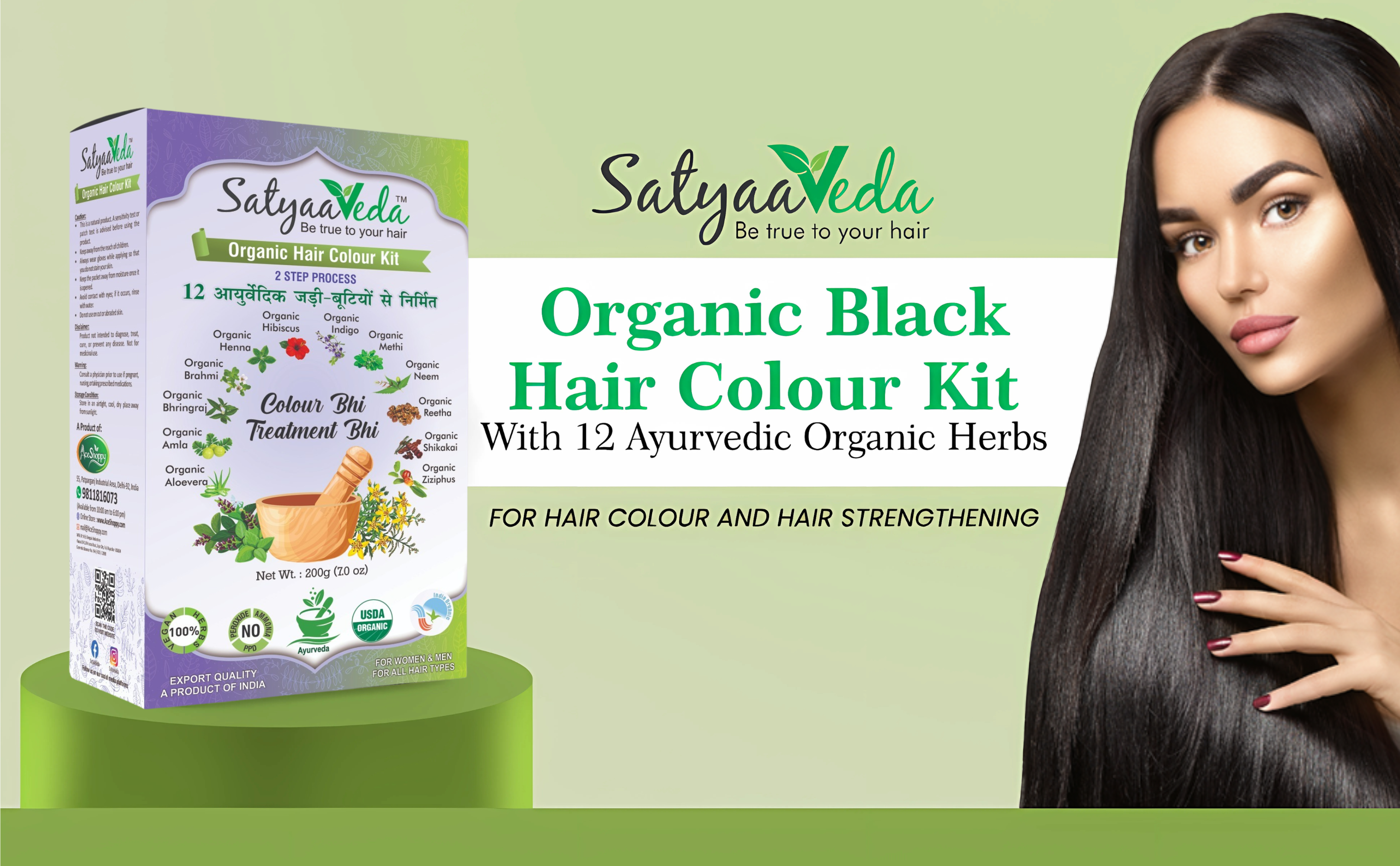 SatyaaVeda Organic 2-Step Hair Colour Kit | 12 Ayurvedic Herbs | Safe & Gentle Hair Colouring | 200g